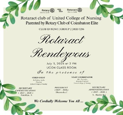 The Rotaract Club of United College of Nursing organized a welcoming ceremony for the new office bearers on 11.07.2025 at Nursing Class Room. The event was conducted to formally introduce and congratulate the newly elected team for the upcoming Rotaract year and to appreciate the outgoing members for their dedicated service.